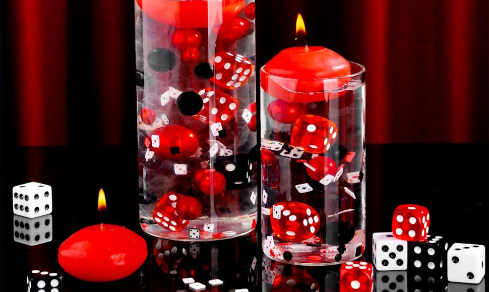 Les centres de table peuvent s'inspirer directement des tables de poker : petits jetons personnalisés, cartes élégamment disposées ou mini-tables décoratives. Même des éléments inattendus, comme des dés transparents remplis de fleurs, apportent une note originale et amusante.